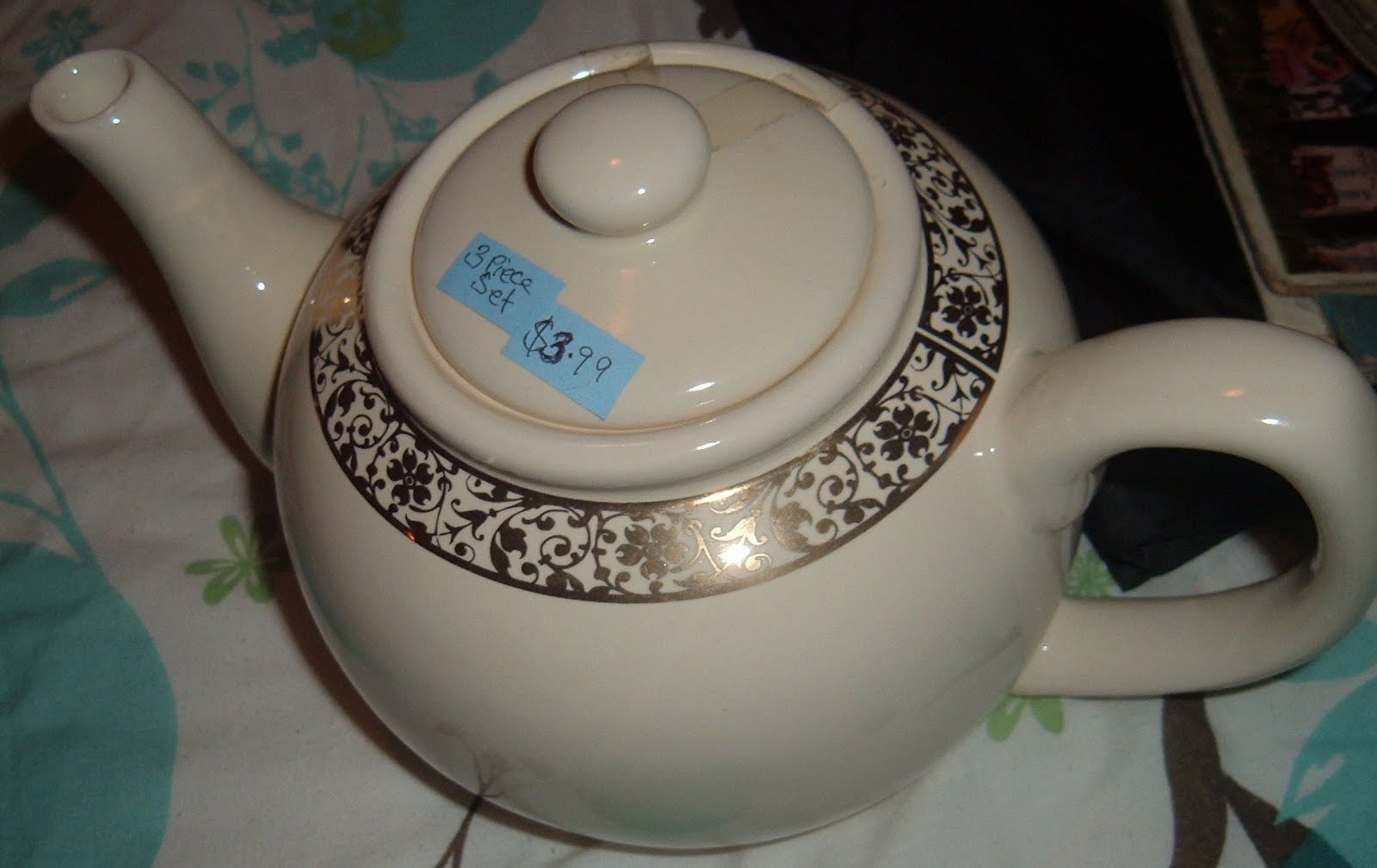 The one the left is a jug, perfect for iced-tea, and the red one is a tea pot, both were $2. This another cute little tea pot I got for $2, it said three piece set but they must have been sold, there were tea bags inside haha. This a one of those old cases that had the hair dryer with the cap attached and you put over your rollers, the dryer isn't there anymore but I love the case, I also have a newer one which I picked up at a Vintage Market. This one cost me $2 and the one from the market was $20!